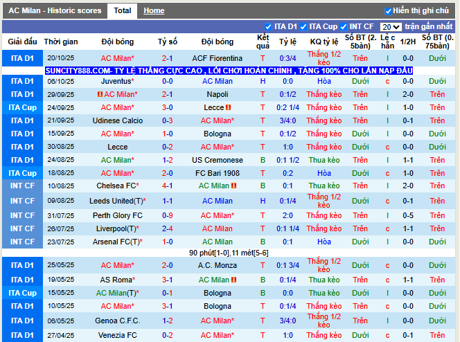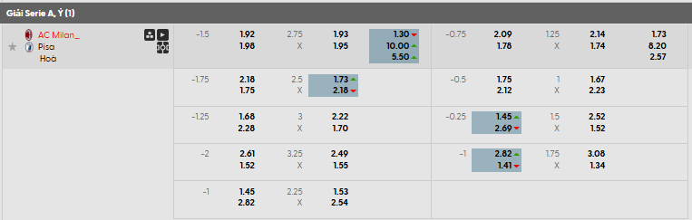Tỷ lệ kèo AC Milan vs AC Pisa