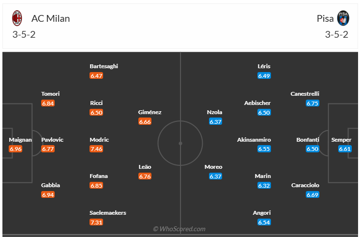 Chỉ phải tiếp đón đội bóng cuối bảng AC Pisa ở trận cầu sớm nhất vòng 8 Serie A, AC Milan với phong độ hủy diệt được dự đoán sẽ dễ dàng giữ 3 điểm ở lại với thánh địa San Siro, qua đó xây chắc vị trí số 1 trên bảng xép hạng.