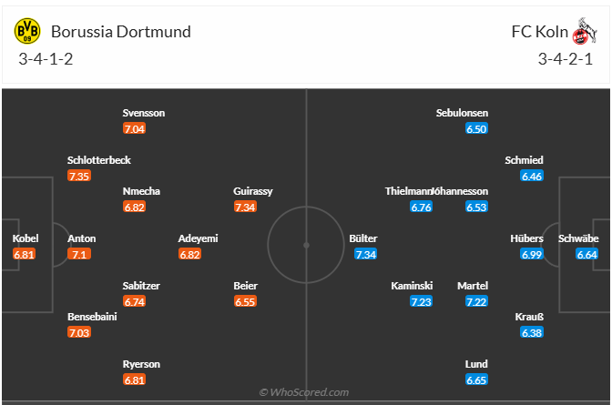 Các cầu thủ khách Koln vừa trở lại với hạng đấu cao nhất nước Đức sau 1 mùa giải phải xuống chơi Bundesliga 2. Không được đánh giá quá cao nhưng đội bóng này lại đang tạo nên khá nhiều bất ngờ ở mùa giải nảm nay. Sau 7 trận, Koln có 11 điểm, đứng thứ 7 và cũng chỉ kém chính vị trí thứ 4 của Dortmund đúng 1 trận thắng.